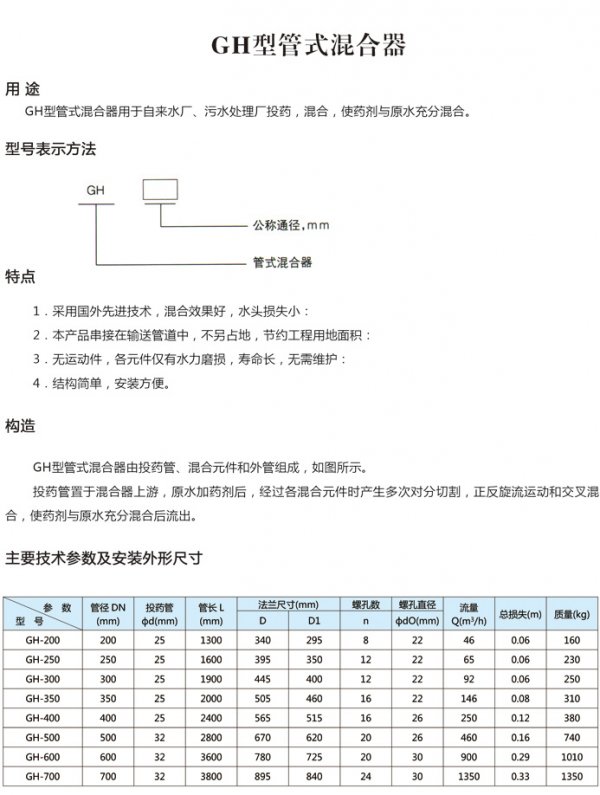 GH型管式混合器用于自来水厂、污水处理厂投药,混台、哦使药剂与原水充分混合。